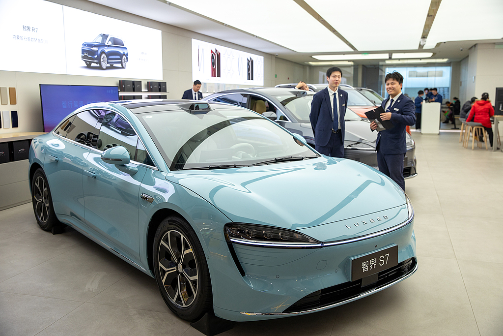 People take a closer look at a Huawei's Luxeed S7 at a shopping mall in Shanghai, Dec 15, 2024. [Photo/VCG]