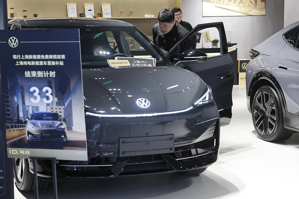 Visitors check out an electric car made by Volkswagen at Longemont Shopping Mall, in Zhongshan park, Shanghai, Dec 1, 2024. [Photo/VCG]