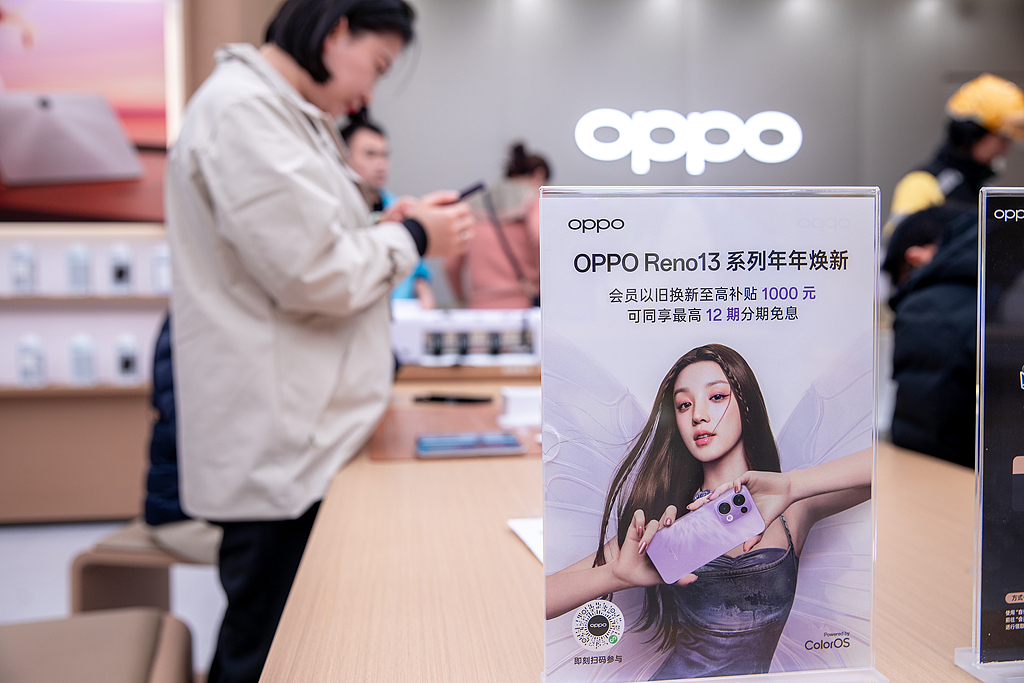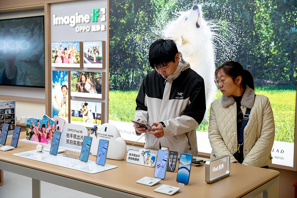 Visitors check out a smartphone at one of Oppo's brick-and-mortar stores in Shanghai, Dec 15, 2024. [Photo/VCG]