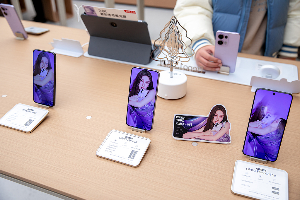 A visitor checks out a smartphone, Oppo Reno 13, at one of Oppo's brick-and-mortar stores in Shanghai, Dec 15, 2024. [Photo/VCG]
