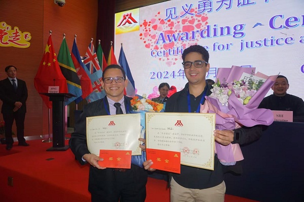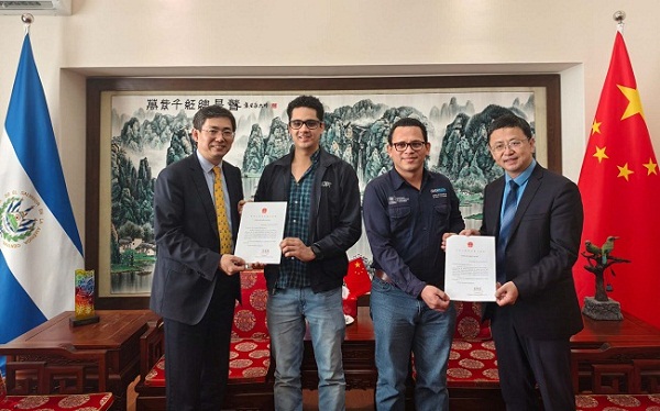 Raul Cortez (2nd from right) and Danilo Vega (2nd from left) are recognized at the Chinese Embassy in El Salvador on Nov 6. [Photo/Embassy of the People's Republic of China in El Salvador]