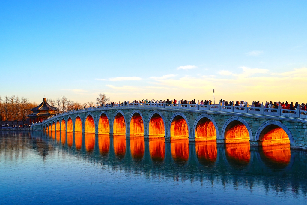 At the Summer Palace, the Seventeen-Arch Bridge dazzles as golden rays pierce its arches. [Photo/IC]