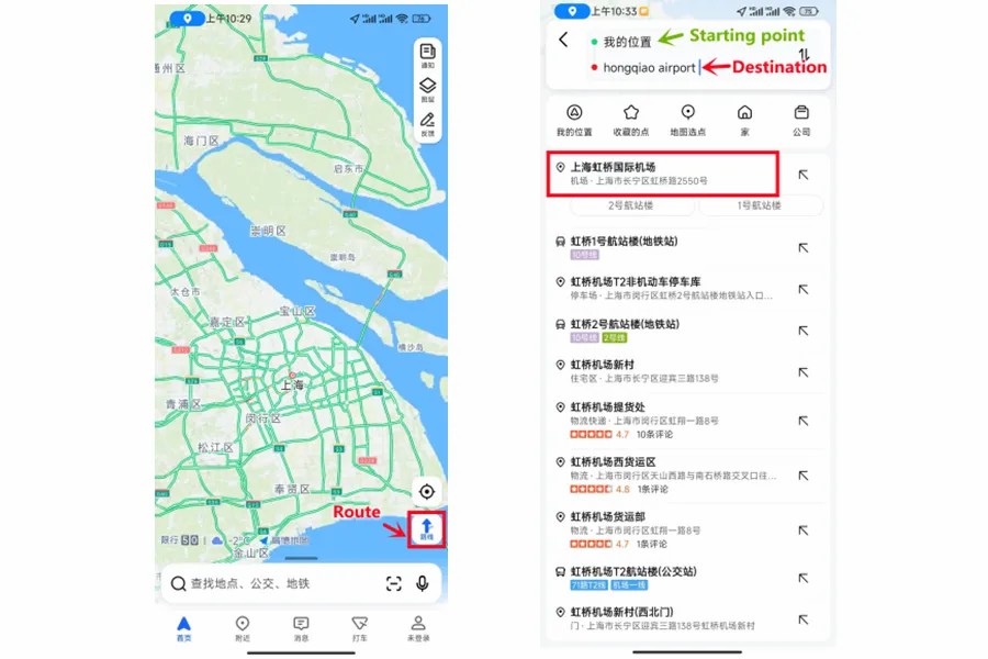 Open it up, click the blue arrow at the bottom for "路线 Route" and type the address in the search bar. The top of the search bar is your starting point, or your current location, and the bottom is your destination. You can enter English, such as "Hongqiao Airport" and the possible options will display in a drop-down menu.