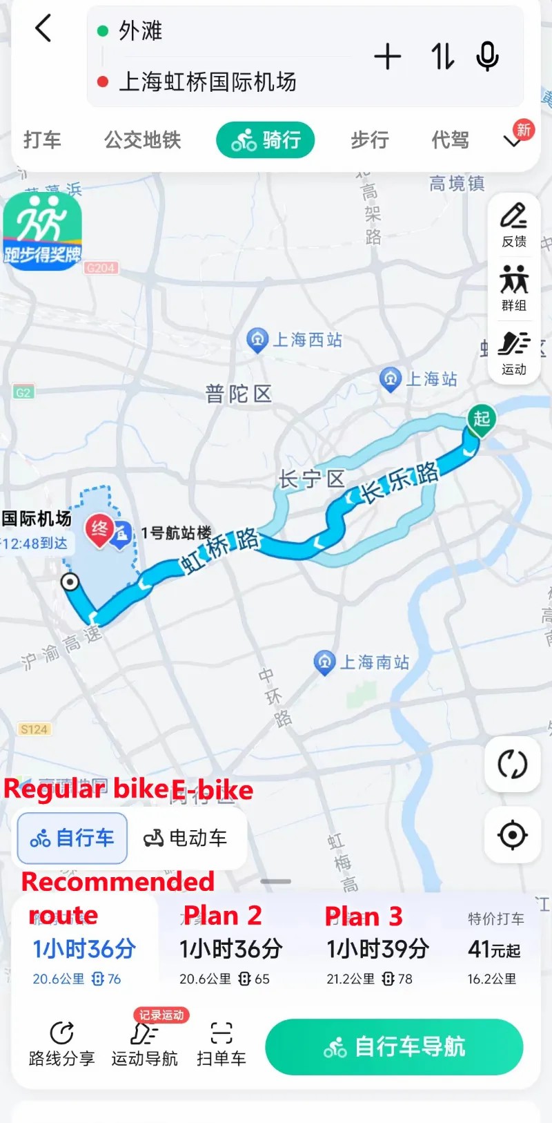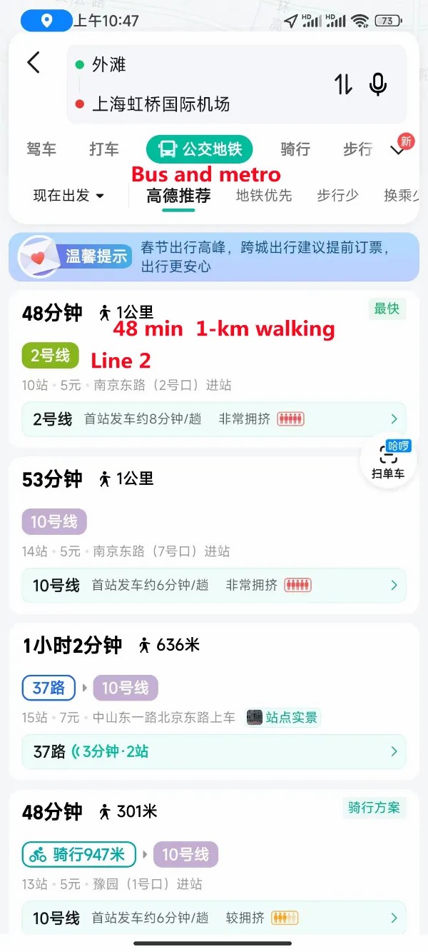 Select the most accurate destination, like "上海虹桥国际机场 Shanghai Hongqiao International Airport". Multiple transportation options will be available – "bus and metro", "driving", "taking a taxi", "biking", or "on foot".