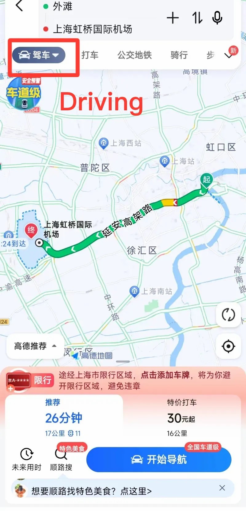 You can also check driving routes to your destination by clicking "驾车 Driving" to use the navigation function.