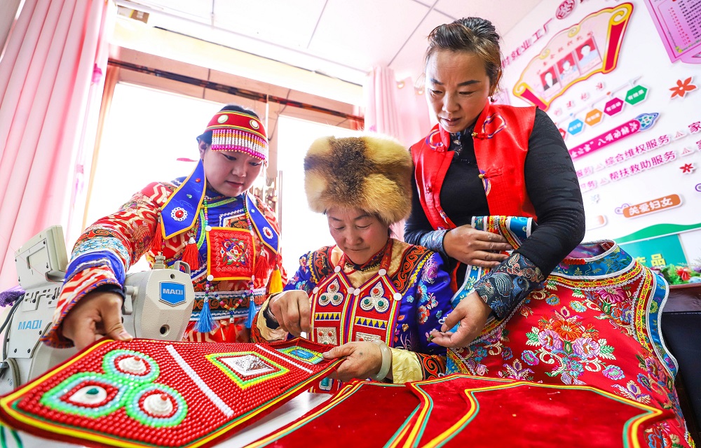 Yugur embroidery enthusiasts exchange ideas about the craft. [Photo/IC]