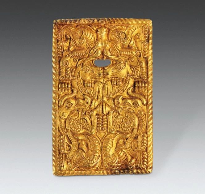 Gold plaque with mythical beast biting horse motifs, Warring States Period (476-221 BC) [Photo/Official WeChat account of Hebei Museum]