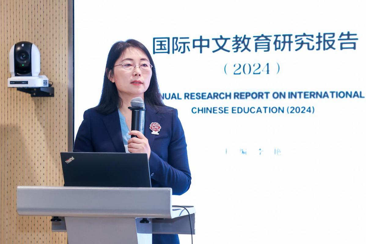 Li Yan, executive head of China Language Industry Research Institute of Capital Normal University, introduces the International Chinese Education Research Report (2024) at its release in Beijing on Friday. She is the chief editor of the report. [Photo provided to chinadaily.com.cn]