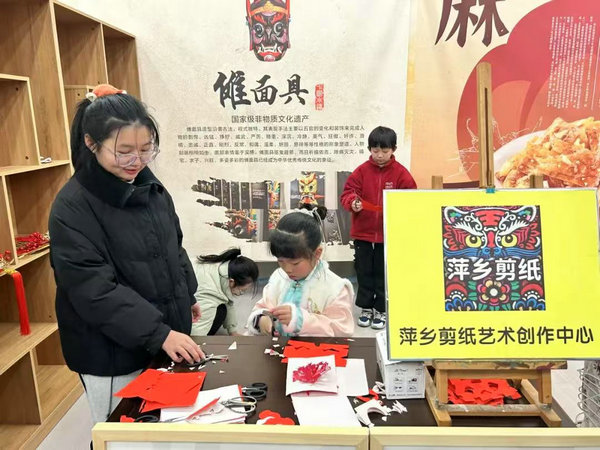 A child experiences Pingxiang paper cutting at the event on Dec. 22, 2024. [Photo/Chinaculture.org]