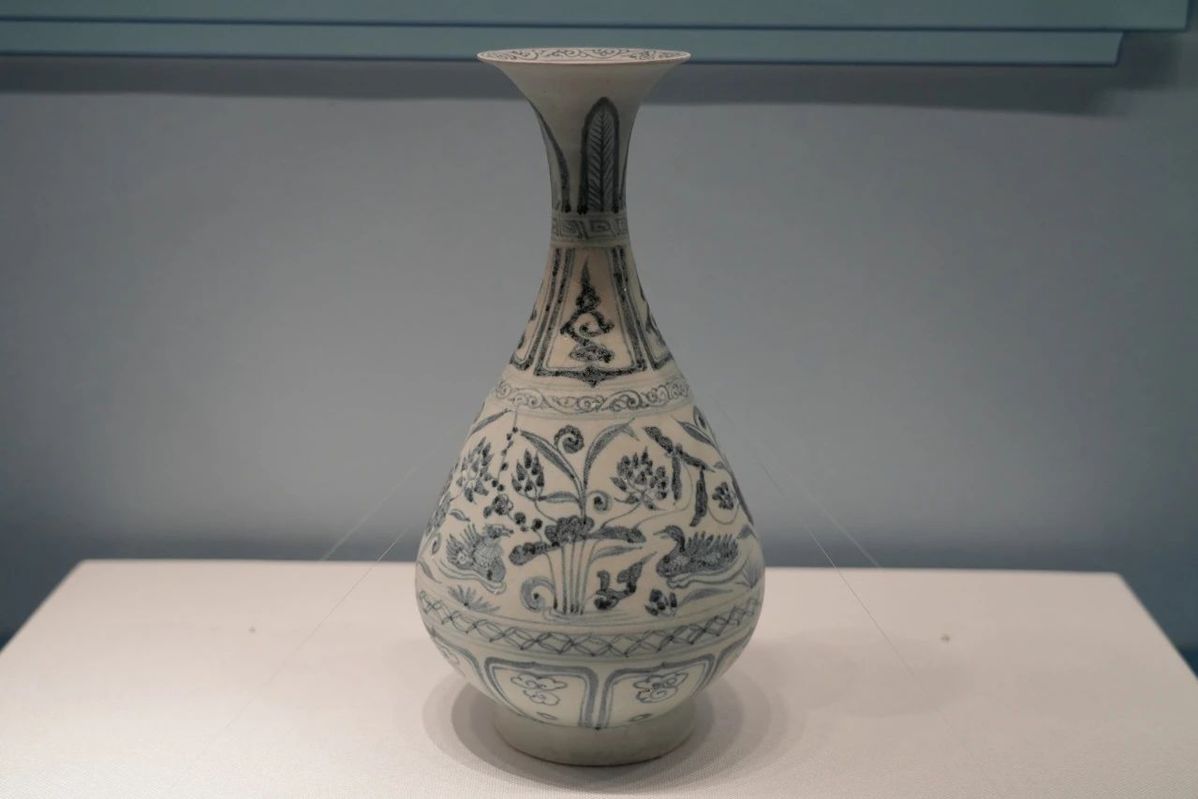 Blue-and-white yuhuchun bottle with lotus pond and mandarin duck motifs, Yuan Dynasty, from the collection of the China (Hainan) Museum of the South China Sea [Photo/Official WeChat account of Shenyang Museum]