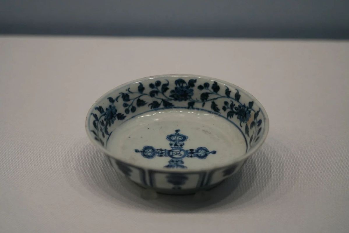 Blue-and-white plate with Vajra pestle motifs, Yuan Dynasty, from the collection of Liaoning Provincial Museum [Photo/Official WeChat account of Shenyang Museum]