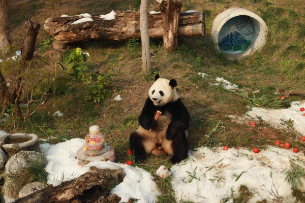 A delightful winter-themed celebration commemorating the first anniversary of the arrival of four giant pandas took place on Thursday at Chongqing Locajoy Theme Park in Chongqing's Yongchuan district. [Photo by Deng Rui/For chinadaily.com.cn]