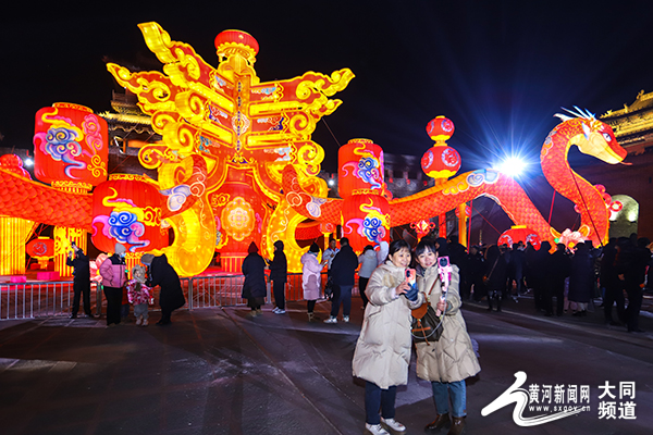 At the lantern festival, lanterns featuring famous historical sites, local customs, and zodiac signs intertwined. The "Prosperous Lion Welcoming Guests" lantern display depicted a lively lion dance welcoming good fortune, while the "Legacy of Chinese New Year" lantern exhibit showcased Datong's traditional cuisine.