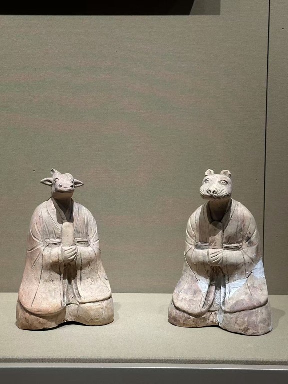 Two pottery figurines with animal heads, representing two of the twelve zodiac of animals, on display at Hubei Provincial Museum [Photo/provided to chinaservicesinfo.com]