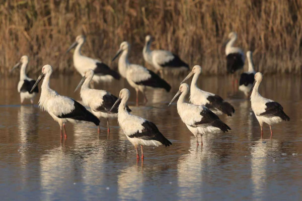 Thirty-three oriental white storks were recently observed in the reed marshes of Maluan Bay in Xiamen, Fujian province. [Photo by Chen Bo/For chinadaily.com.cn]