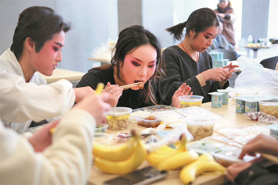 Before a Yueju Opera performance in Nantong, Jiangsu province, Jiang (center) eats with colleagues.[Photo provided by Xu Peiqin/For China Daily]