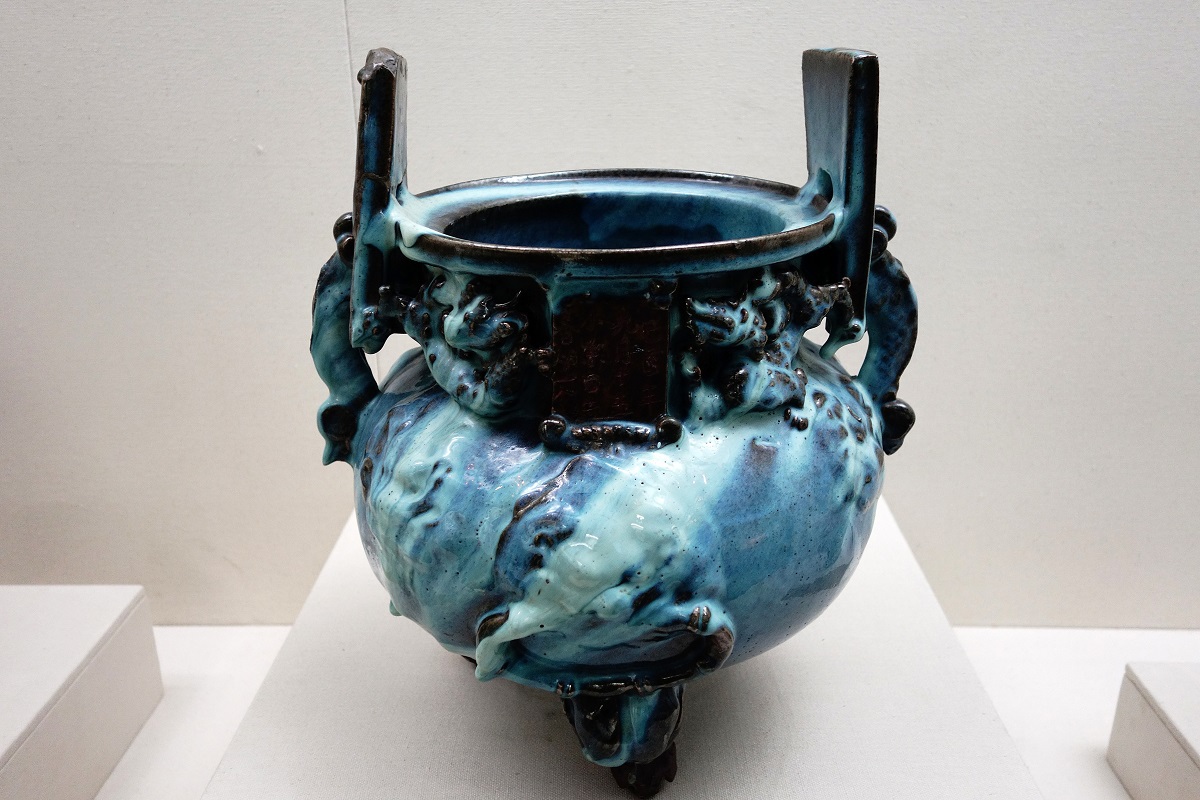 This extraordinary piece holds the title of the largest, most complete and most intricately crafted Jun kiln incense burner ever found in China. About 42.7 cm high, it has a mesmerizing blue glaze with varying shades. Bold beast and dragon motifs perfectly complement the rich flowing glaze. Its inscription reveals the burner was crafted on the 15th day of the ninth lunar month of the jiyou year by a craftsman surnamed Song, during the Yuan Dynasty (1271-1368).