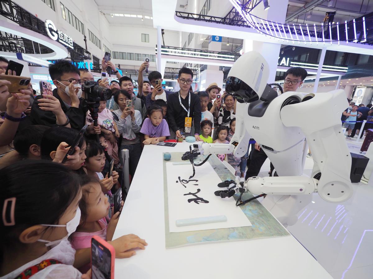 People gather around and watch a humanoid robot write calligraphy during the 2024 World Robot Conference in Beijing on Aug 22. [DU JIANPO/FOR CHINA DAILY]