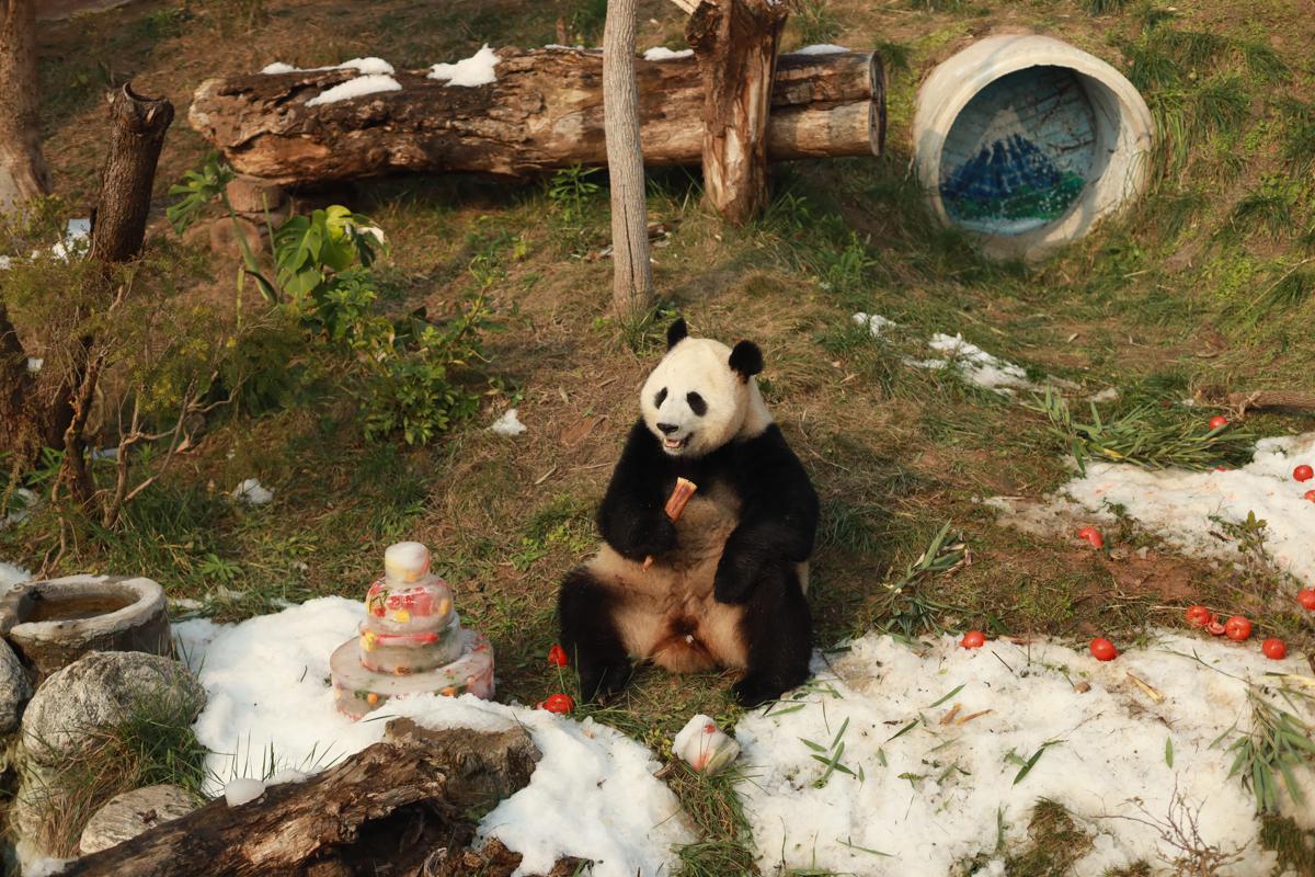 Giant pandas celebrate first year in Chongqing with snowy spectacle