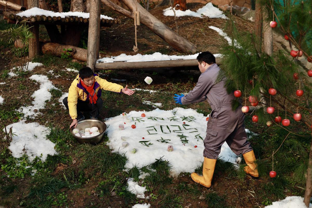 Giant pandas celebrate first year in Chongqing with snowy spectacle