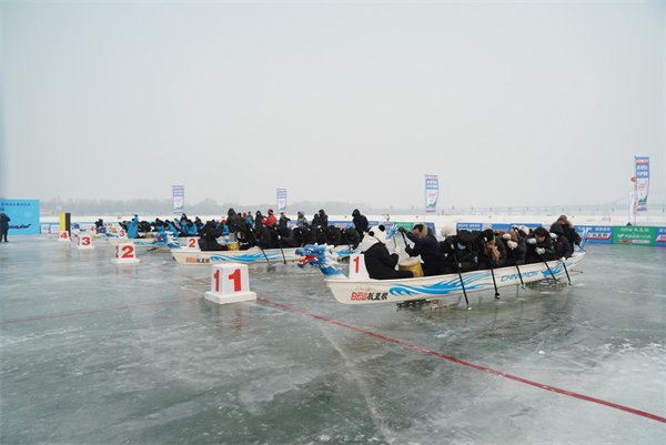 Participants race in an ice dragon boat event on the frozen Songhua River in Harbin, Heilongjiang province on Tuesday. [Photo provided to chinadaily.com.cn]