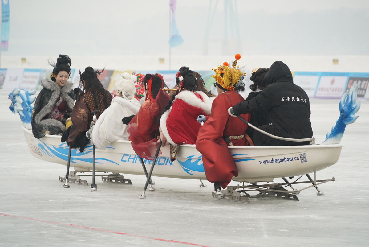 Participants race in an ice dragon boat event on the frozen Songhua River in Harbin, Heilongjiang province on Tuesday. [Photo provided to chinadaily.com.cn]