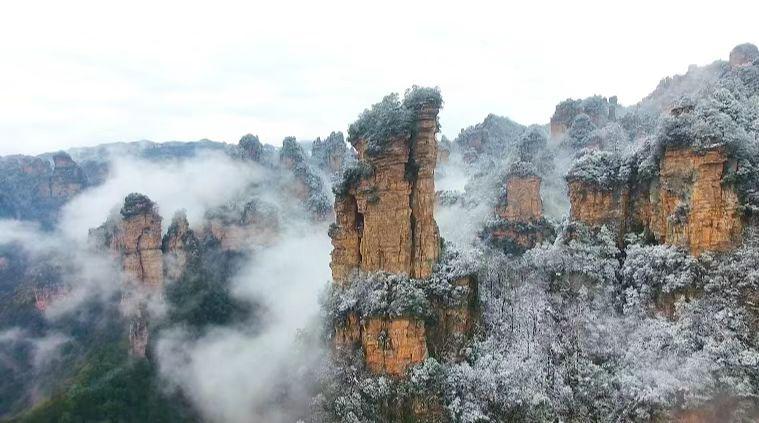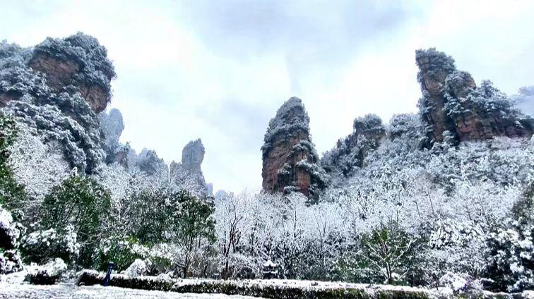 With temperatures dropping, the Wulingyuan Scenic Area of Zhangjiajie in Hunan province welcomed snowfall on Wednesday, creating a picturesque winter wonderland.