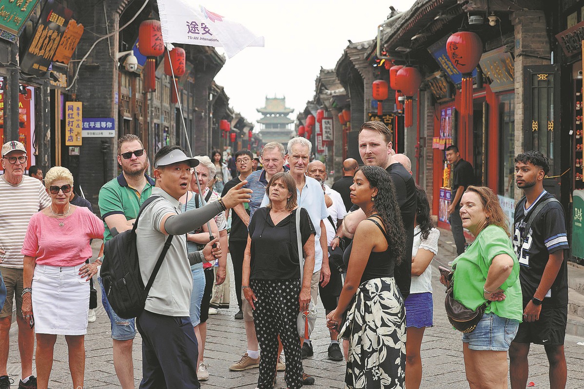 A tour guide introduces Pingyao Ancient City in Shanxi province to a group of foreign visitors on Sept 3. ZHU XINGXIN/CHINA DAILY