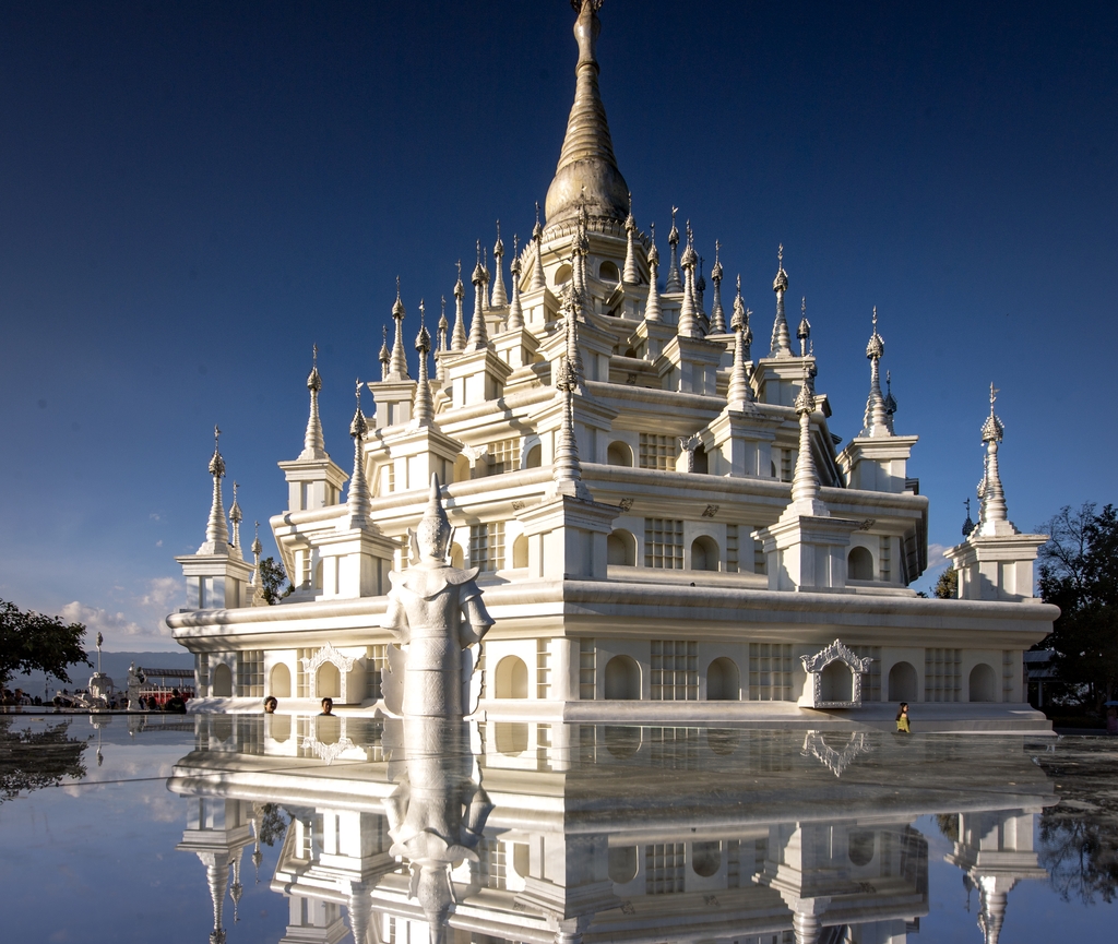 Standing 66 meters tall and 46 meters in diameter, this stunning white pagoda contrasts beautifully with the nearby Menghuan Golden Pagoda. Its pure white design symbolizes the elegance and purity of love, family, and friendship.