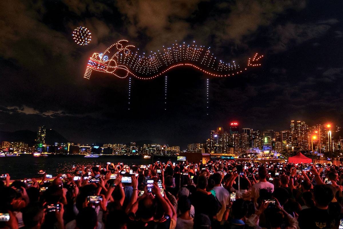 Visitors enjoy a Mid-Autumn Festival drone show over Victoria Harbour in Wan Chai, Hong Kong, on Sept 17, 2024. ​EDMOND TANG/CHINA DAILY