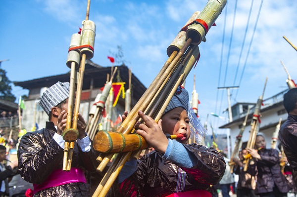 Local Miao people dress in festive attire and gather to play the lusheng (a traditional wind instrument), do the lusheng dance, and celebrate the traditional holiday to welcome the New Year. [Photo/chinadaily.com.cn]
