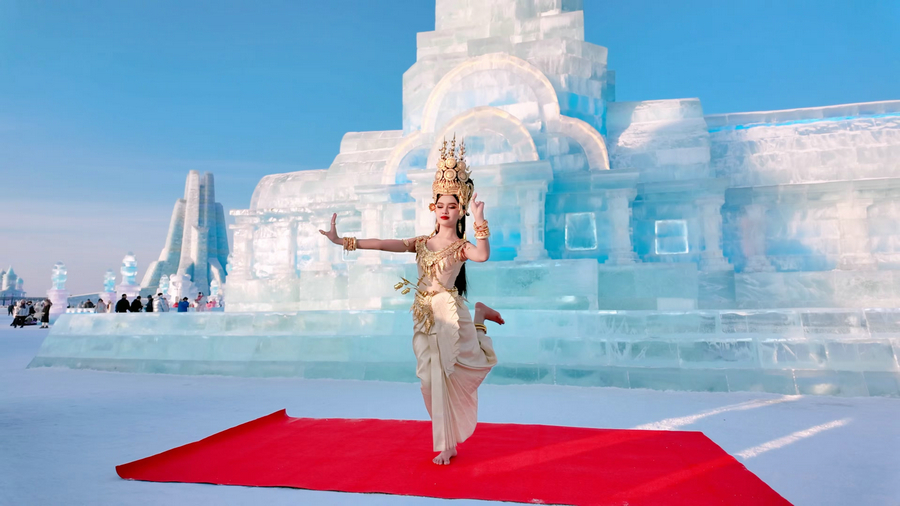 Cambodian artist Choury Laorhours performs the Apsara dance at the Harbin Ice and Snow World in Northeast China’s Heilongjiang province, on Jan 5, 2025. [Photo provided to chinadaily.com.cn]