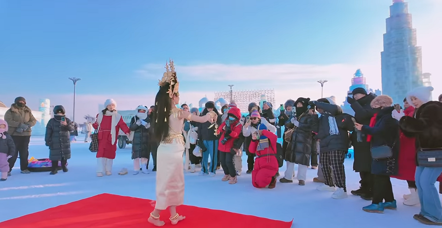 Tourists at the Harbin Ice and Snow World are enchanted by Cambodian artist Choury Laorhours’ performance of the Apsara dance on Jan 5, 2025. [Photo provided to chinadaily.com.cn]