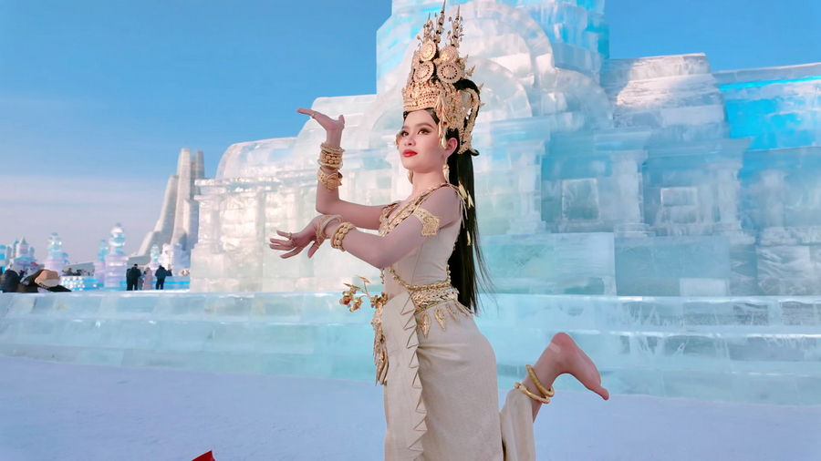 Cambodian artist Choury Laorhours performs the Apsara dance at the Harbin Ice and Snow World in Northeast China’s Heilongjiang province, on Jan 5, 2025. [Photo provided to chinadaily.com.cn]