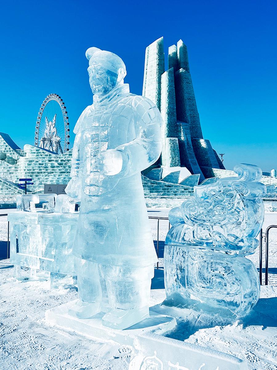 An ice sculpture of terracotta warriors is on display at Harbin Ice and Snow World in Harbin, the capital of Northeast China's Heilongjiang province. [Photo provided to chinadaily.com.cn]