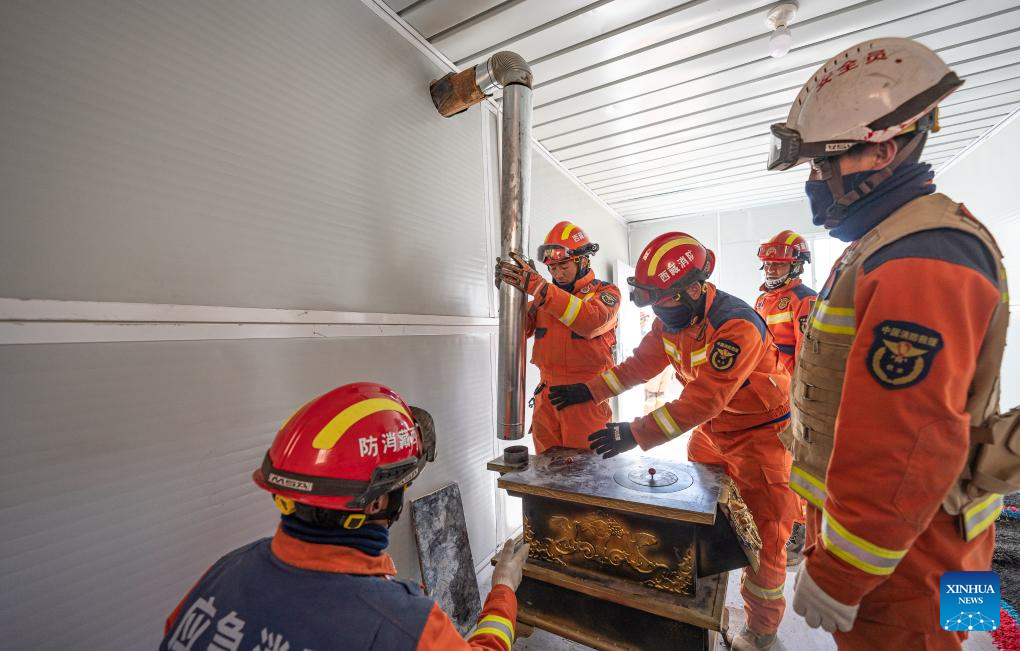 Firefighters install a heating facility for quake-affected residents inside a makeshift house in Yejiang village of Dingri county in Shigatse, Southwest China's Xizang autonomous region, Jan 13, 2025. [Photo/Xinhua]