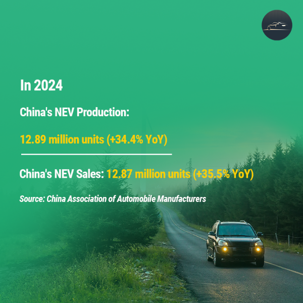 In 2024, NEV production and sales reached 12.89 million and 12.87 million units, up 34.4 percent and 35.5 percent year-on-year, with sales accounting for 40.9 percent of total new car sales, up 9.3 percentage points from the previous year.