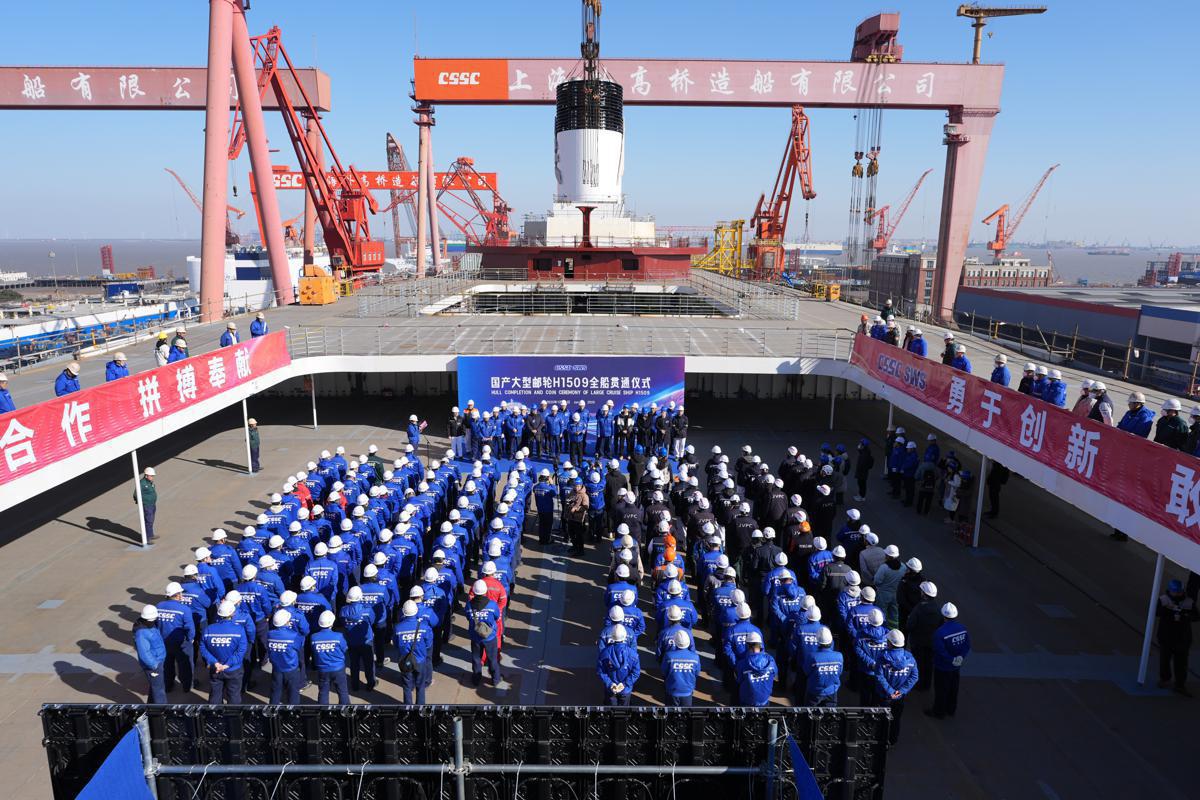 "It took us less than nine months to complete the hull structure assembly, two months sooner than the first one," said Wang Qi, chairman of China State Shipbuilding Corp (CSSC) Shanghai Waigaoqiao Shipbuilding Co Ltd during the celebrating ceremony held on Wednesday morning at its builder Shanghai Waigaoqiao Shipbuilding Co Ltd.