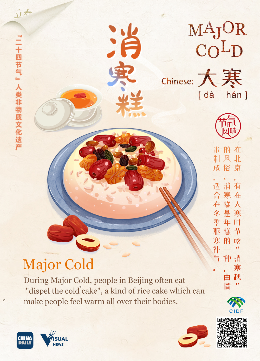 During Major Cold, People in Beijing have a habit of eating "dispelling cold cake", a kind of rice cake. Sticky rice, the cake's main ingredient, contains more sugar than rice, which can make people feel warm all over their bodies. In Chinese the word "rice cake" has the same pronunciation with the word "higher in a new year", which symbolizes good luck and continual promotion.