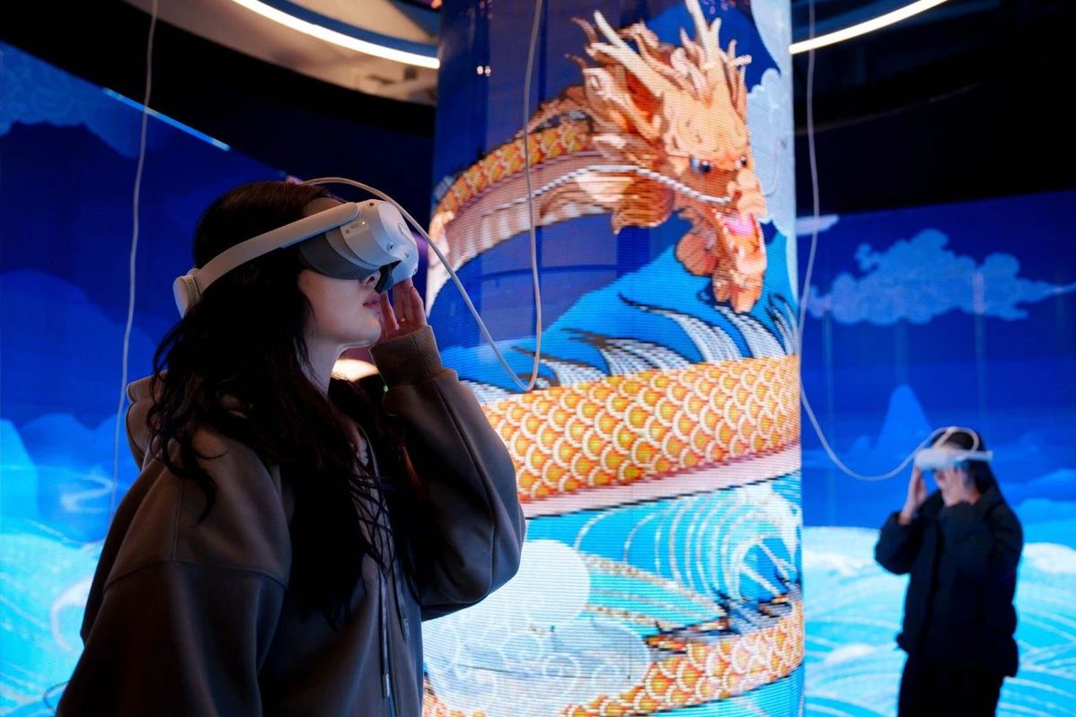 Visitors wearing VR headsets enjoy a Palace Museum immersive experience. [Photo/Official WeChat account of the Palace Museum]