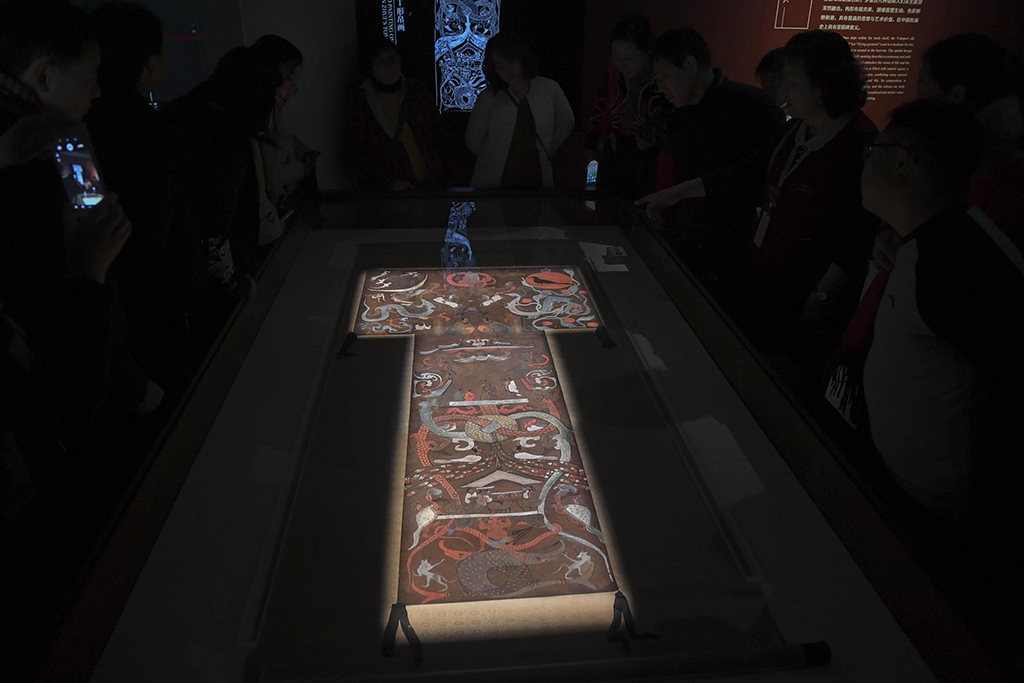 The T-shaped silk painting from Xin Zhui’s tomb displayed at the Hunan Museum. [Photo/VCG]