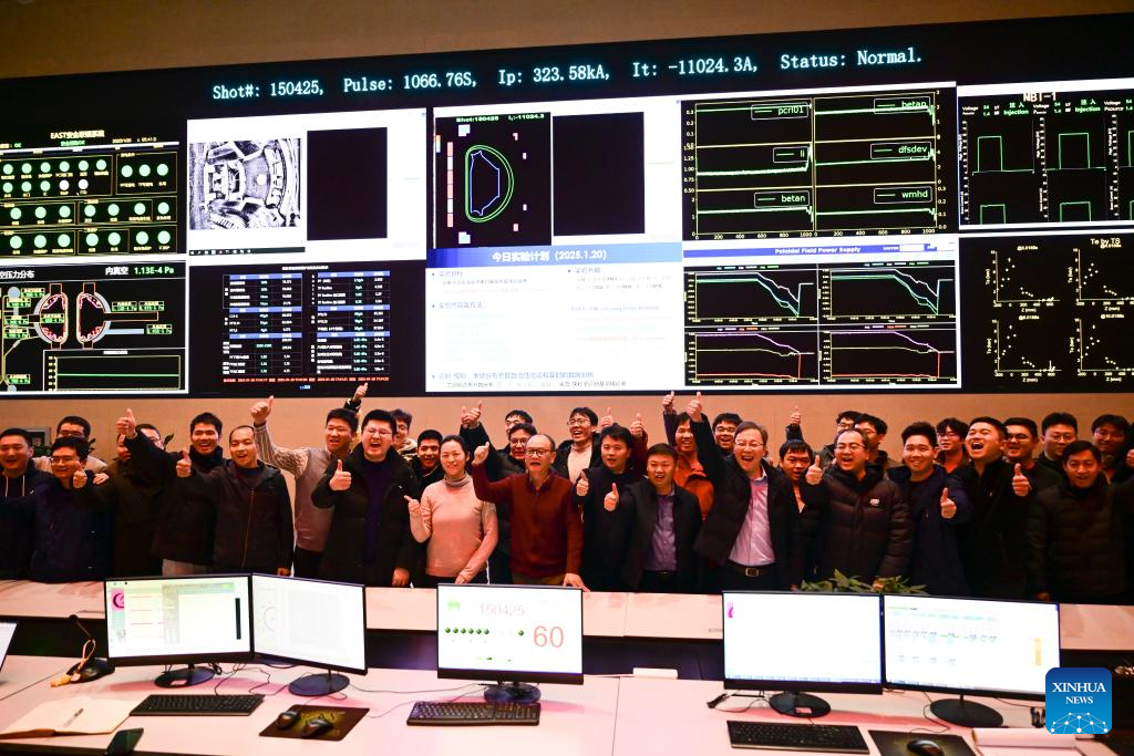 HEFEI -- The Experimental Advanced Superconducting Tokamak, dubbed China's "artificial sun," maintained a steady-state high-confinement plasma operation for a remarkable 1,066 seconds on Monday, setting a new world record and marking a breakthrough in the quest for fusion power generation.