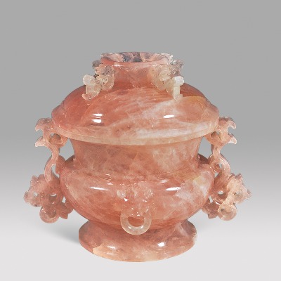 Rose quartz lidded incense burner with chi dragon-shaped ears