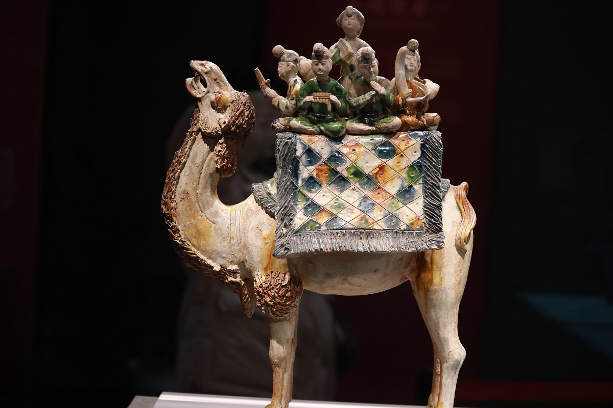 Do you want to enjoy a unique performance from the Tang Dynasty (618-907)? A sancai pottery figure shows a howling camel bearing on its back an itinerant band: seven male musicians and a female singer. The musicians sit around the singer on an elevated saddle, wearing Chinese-style clothing but playing musical instruments that were introduced from Central Asia.