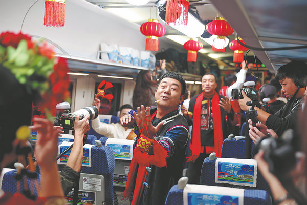 Singers from Yunnan province interact with passengers onboard train D87 from Kunming to Vientiane on Jan 14, the start of the Spring Festival travel rush. [Photo by CHEN FEI/FOR CHINA DAILY]