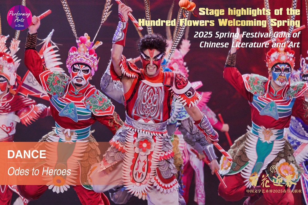 An excerpt of the dance drama Ode to Heroes lit up the stage at the Hundred Flowers Welcoming Spring: 2025 Spring Festival Gala of Chinese Literature and Art. It showcases the charm of the Yingge dance, a form of folk dance popular in South China's Guangdong province that merges opera, dance and martial arts.