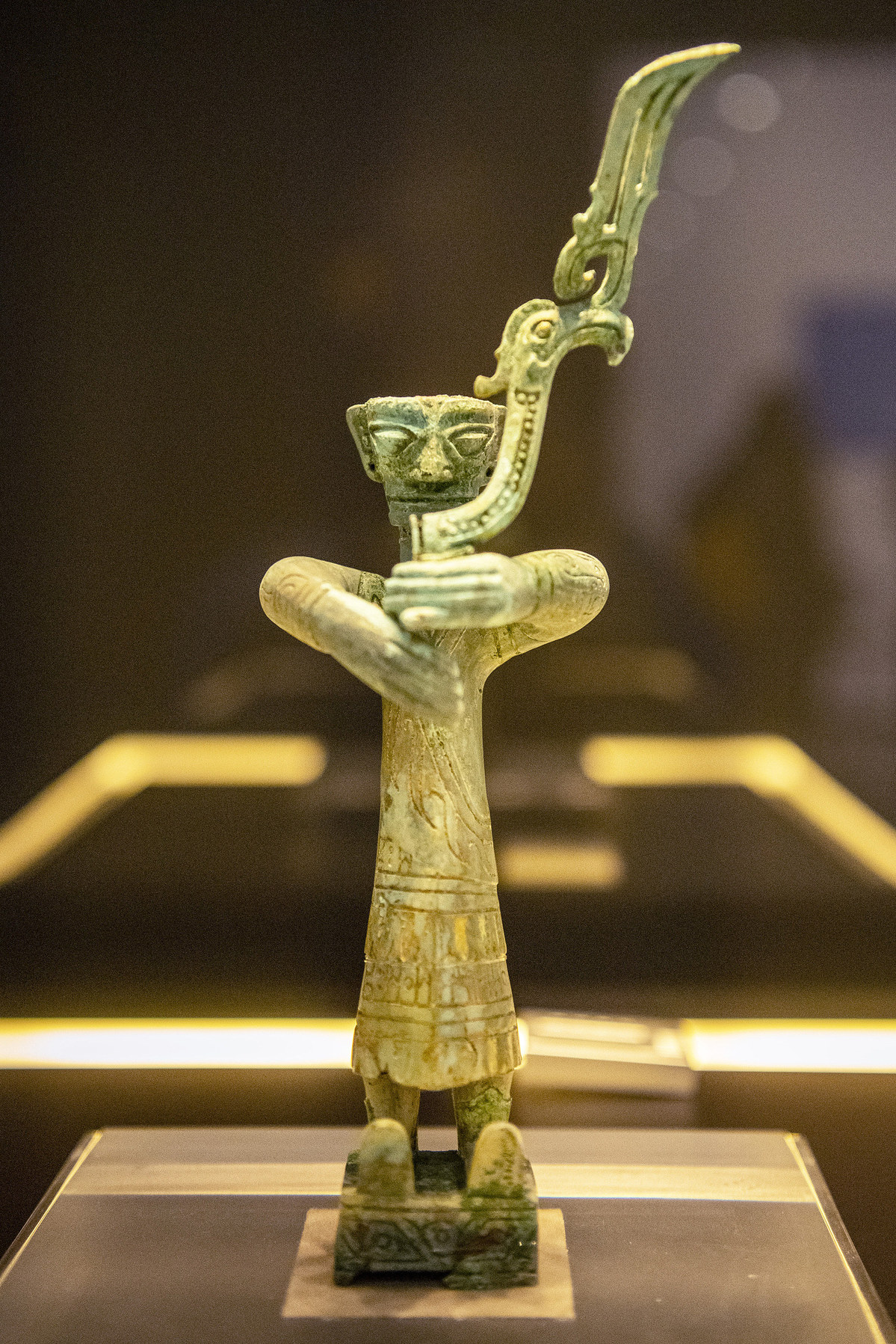 A bronze statue of a standing man holding a bird is on display at the Sanxingdui Museum in Sichuan province. [Photo/VCG]