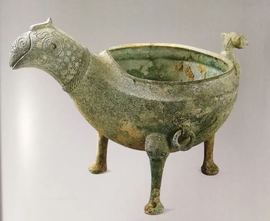 In ancient China, aristocrats washed their hands and faces using a yi (water container) to pour water and a pan (water container) to hold waste water. Here is a bronze yi with a phoenix-head-shaped spout, dating back to the early Warring States Period (475-221 BC). Feather and scale patterns adorn its belly. A smaller bird head embellishes its curled bird-tail-shaped handle.
