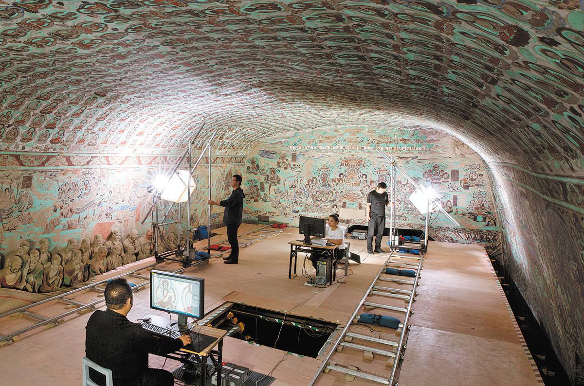 Workers conduct a digital collection of murals at Cave 148 of the Mogao Grottoes in Dunhuang, Gansu province. CHINA DAILY