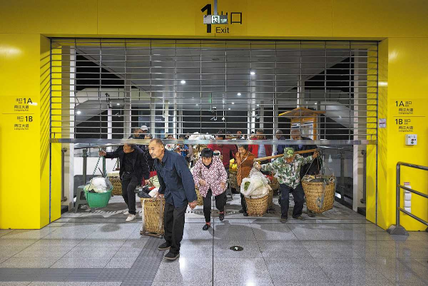 Farmers begin entering the station with their back baskets full of vegetables and fruits at 6 am, the moment the gate of Shichuan Station on Line 4 opens on Nov 2, 2024. [LIU SONG/ZHAO DANDAN/FOR CHINA DAILY]